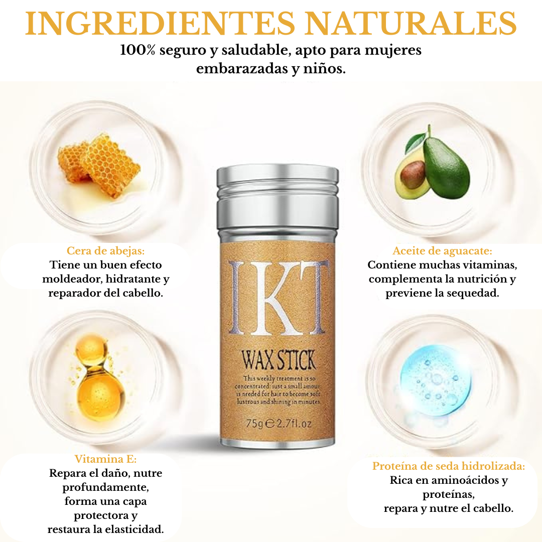 Con ingredientes naturales como cera de abejas, aceite de aguacate y vitamina E, que aportan suavidad, brillo y reparación al cabello.